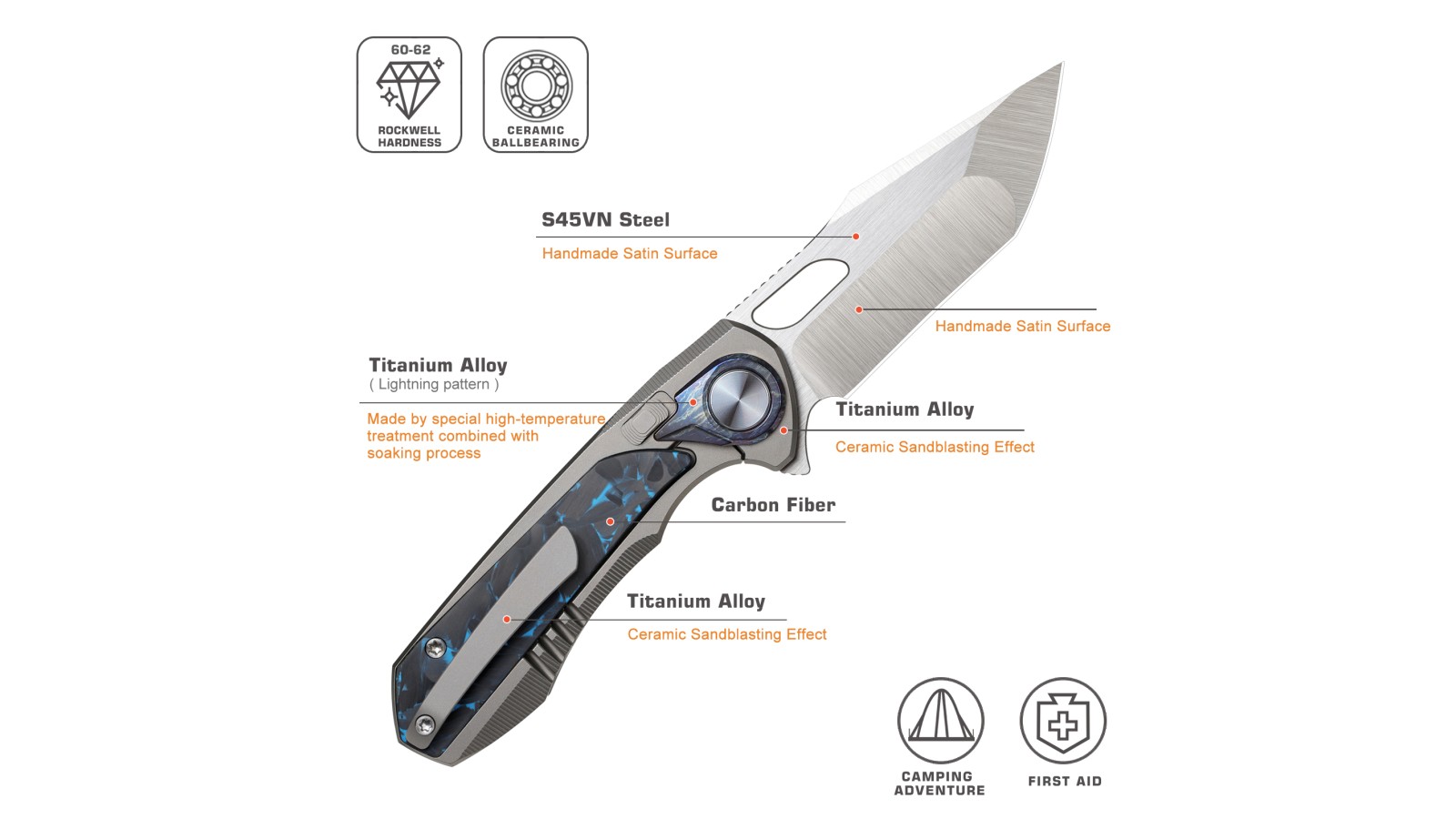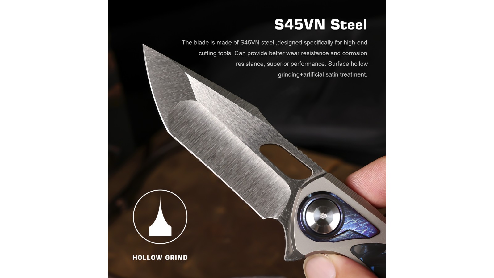 La lame est forgée dans un acier inoxydable S45VN, un matériau haut de gamme reconnu pour son excellente rétention de coupe et sa résistance à la corrosion. Elle mesure 76mm de longueur pour une épaisseur de 3,5mm, des dimensions qui offrent un compromis idéal entre polyvalence et robustesse. La dureté Rockwell de 59-61 HRC vous garantit un tranchant durable qui résiste à l'usure quotidienne.