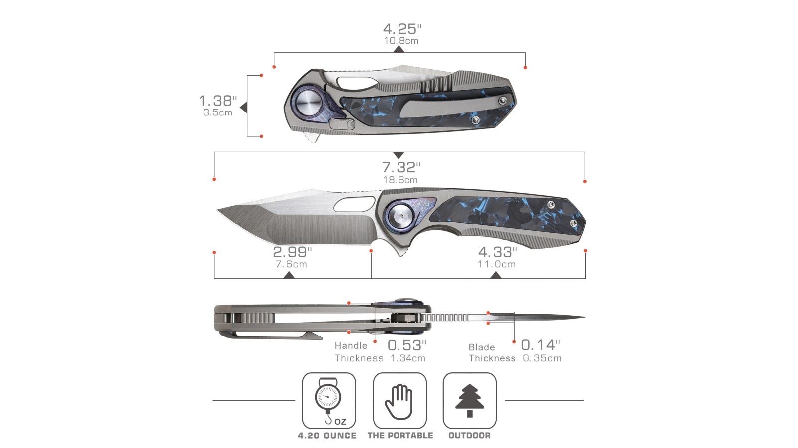 Le manche associe titane et fibre de carbone pour créer une structure légère, résistante et esthétiquement remarquable. Le titane gris forme l'ossature principale tandis que les inserts en fibre de carbone bicolore apportent une touche d'élégance distinctive. Cette combinaison de matériaux vous offre une prise en main sûre sans alourdir l'outil. L'épaisseur du manche de 13,4mm garantit une préhension confortable même lors d'utilisations prolongées.