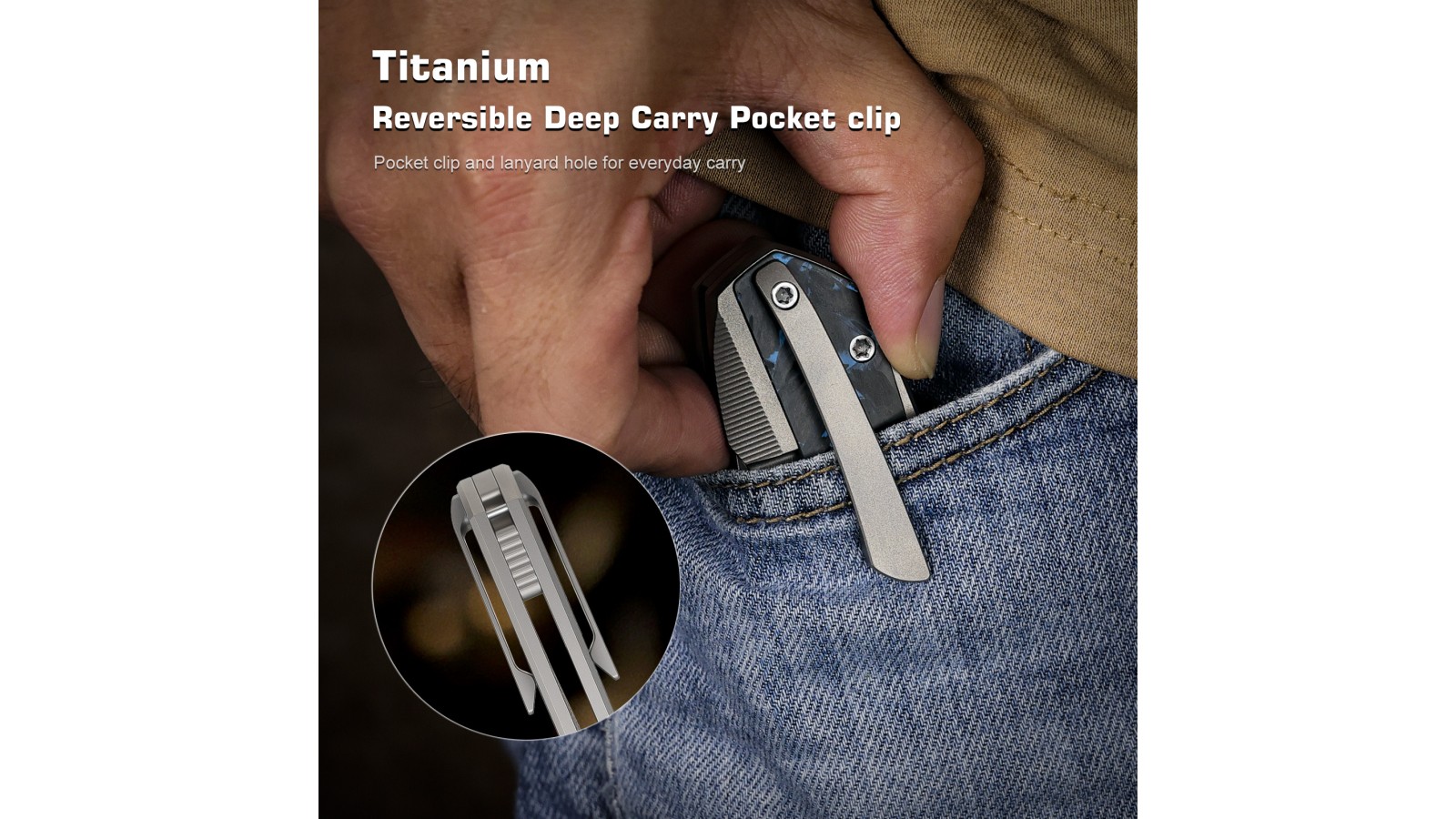 Le clip de poche en titane se fixe en position tip-up (pointe vers le haut) pour un port main droite. Cette configuration facilite le dégainage rapide et intuitif. Vous glissez le couteau dans votre poche avec la certitude qu'il reste parfaitement en place. Les vis et le bouton poussoir en titane complètent l'ensemble des composants premium de cet outil d'exception.