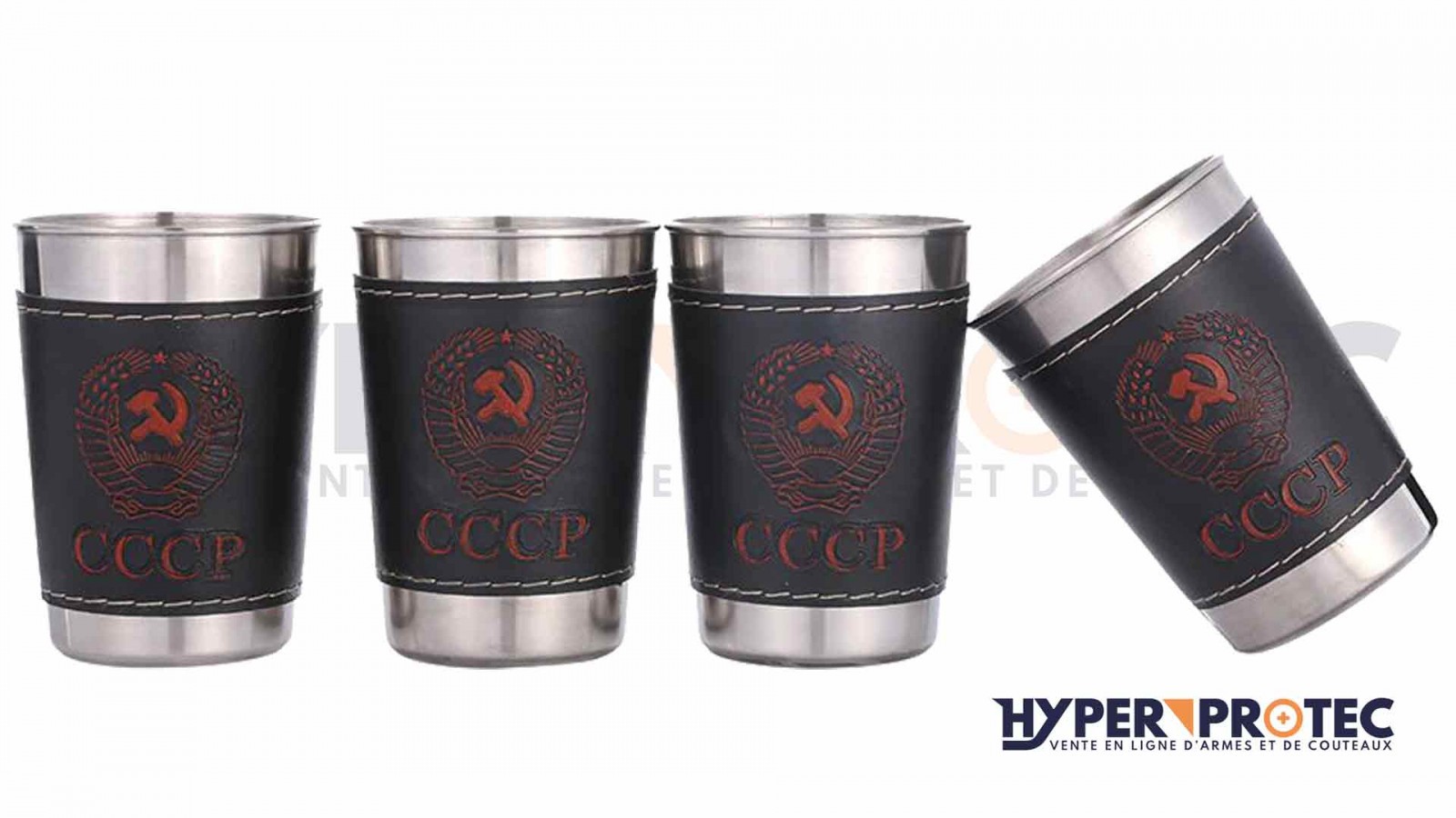 Jeu de quatre gobelets en inox de 17cl pour boire un verre d'alcool en extérieur entre amis. Un moment de convivialité pour 4 personnes avec une flasque à alcool, ces gobelets seront l'accessoire idéal. Pour une idée de cadeau original pour un chasseur, un pêcheur ou un randonneur qui saura reconnaitre le sigle CCCP de l'ex russie.