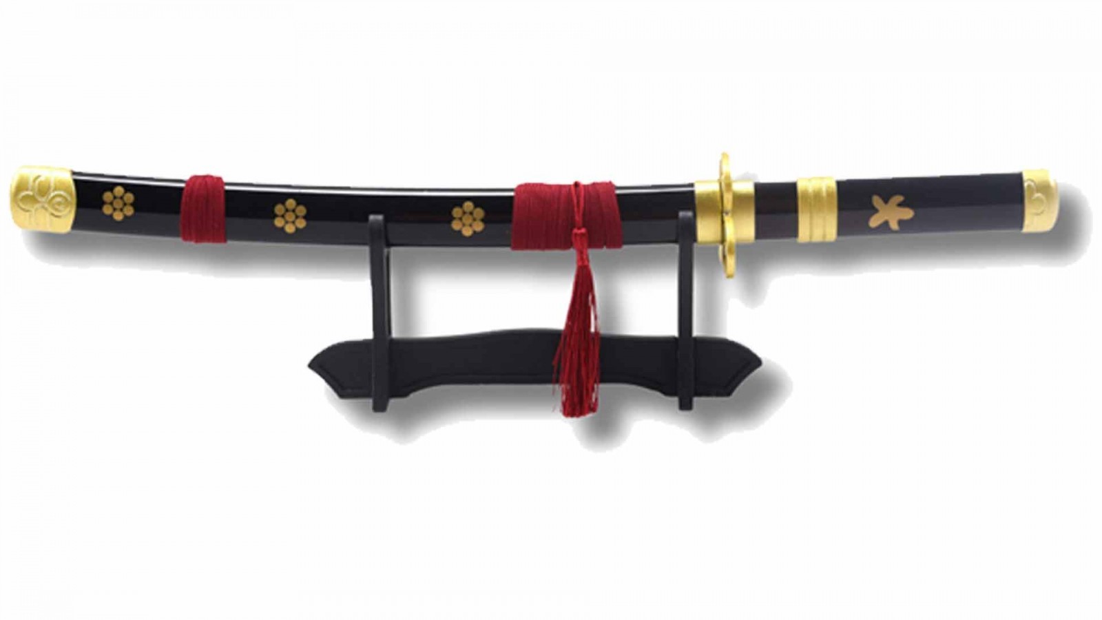 Les passionés d'art japonais reconnaitrons ce katana dans son fourreau posé sur un support dans la plus pure tradition asiatique. Reproduction fidèle, ce mini katana à lame en acier peut se retirer de son fourreau légèrement courbe comme son grand frère le katana. Le style est raffiné en coloris noir et or avec comme soucis du détail un enroulement de tissus bordeaux orné d'un ponpon à franges.